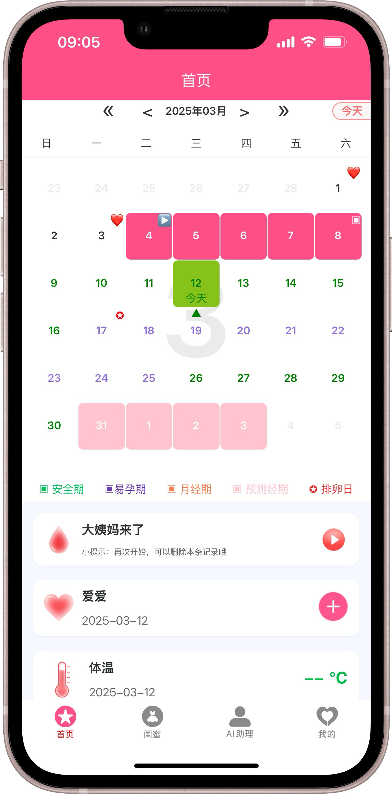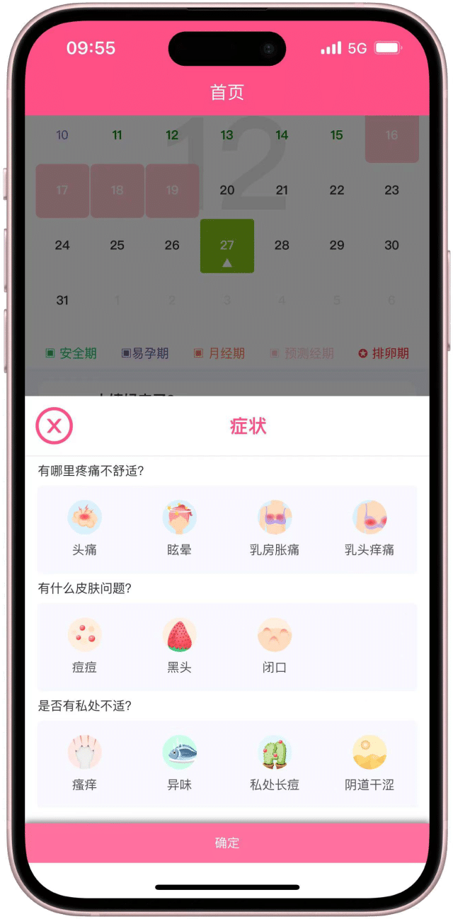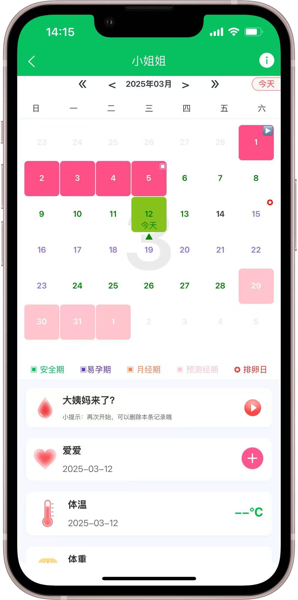月经周期记录,爱爱记录,不适症状记录,体重体温记录,各种健康状况随时记录,随时查看
